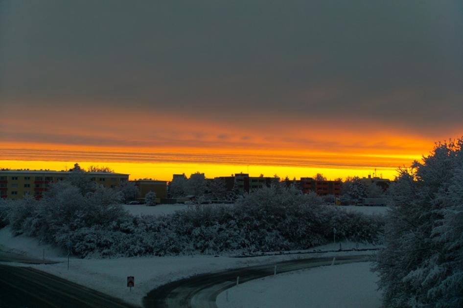 Nach dem es gestern Abend in Süddeutschland teils für Stunden kräftig geschneit hat, gab es am frühen Morgen des 21. Januar 2012 im Landkreis Fürstenfeldbruck eine verschneite Winterlandschaft mit 14 Zentimeter Neuschnee. Der nasse Schnee klebte teilweise dick an den Bäumen und Büschen. Kurz vor Eintreffen der Warmfront gab es im Osten einen wunderschönen Sonnenaufgang zu beobachten. Nach 09 Uhr kam es erneut zu weiteren starken Schneefällen im Raum Fürstenfeldbruck wodurch nochmals Neuschnee fiel. Ab Mittag setzte dann starkes Tauwetter mit Regen ein.