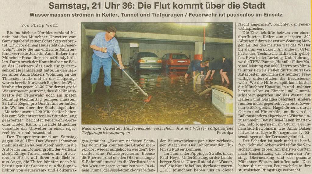 Auch die Landeshauptstadt München wurde heimgesucht. Die Wassermassen strömten in Keller, Tunnel und Tiefgaragen. In einigen Straßentunnels hockten die Fahrer auf den Dächern ihrer Autos und hofften, daß die Fluten nicht noch höher steigen würden. 82 Liter/qm hatten die Wolken über der Stadt abgeladen.