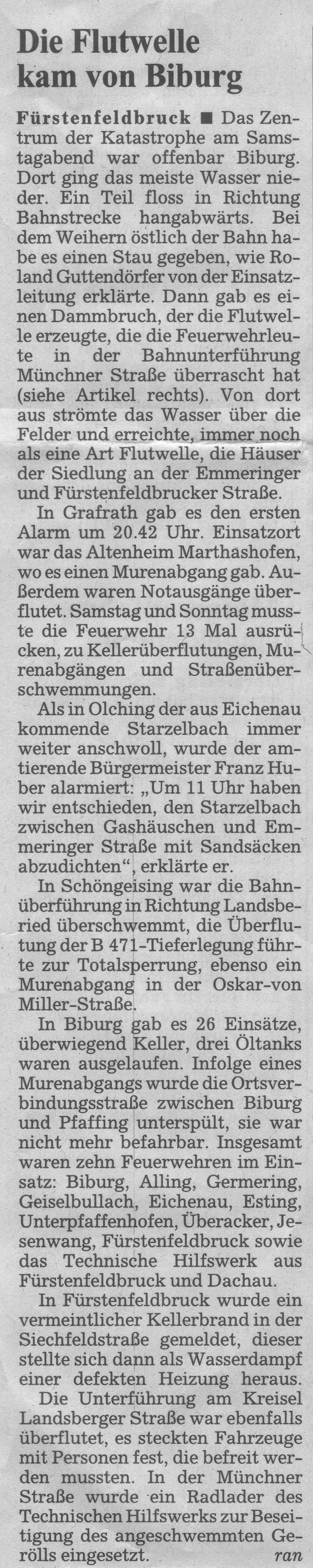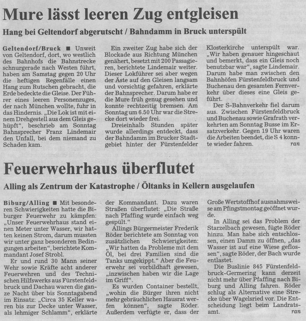 Auch in der Kreisstadt und in den Orten Grafrath, Olching, Emmering, Eichenau und Schöngeising gab es Landunter. In der Nähe des Fürstenfelder Klosters mußte ein Gleisbautrupp die unterspülte Bahnstrecke reparieren.