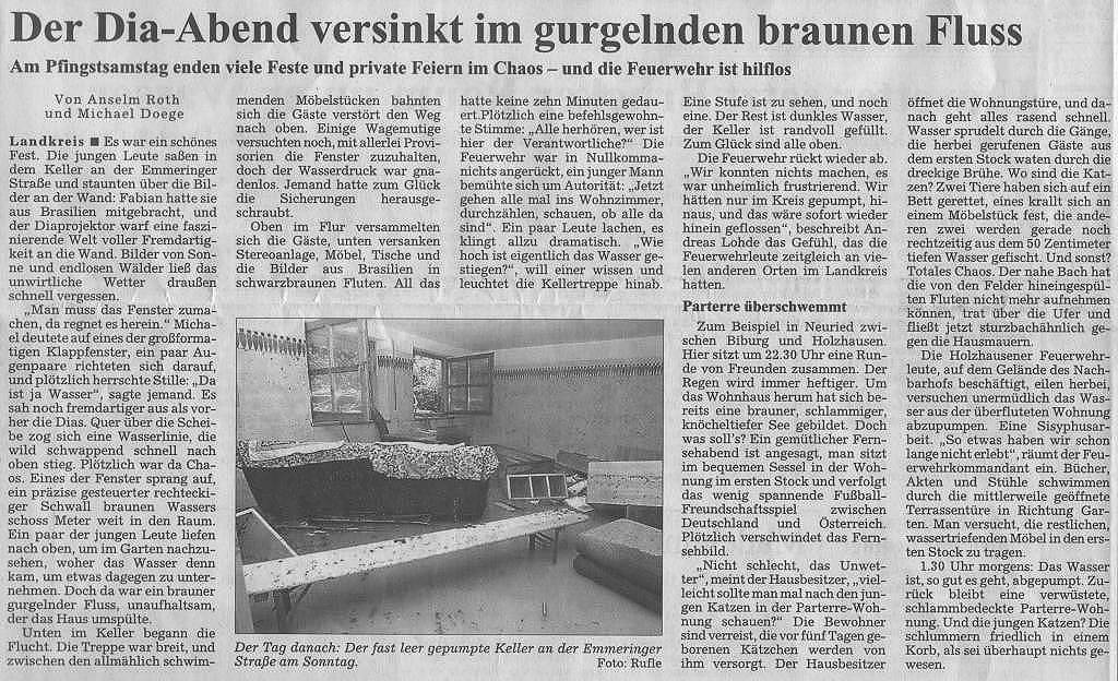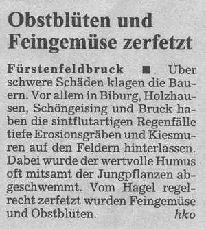 Aber auch in allen übrigen Gemeinden des Landreises gab es nasse Füße und Keller. Die Feuerwehren hatten für Stunden alle Hände voll zu tun. Die sintflutartigen Regenfälle verursachten auf den Feldern tiefe Erosionsgräben und schwemmten Humus teils mit den Jungpflanzen hinweg. Obstblüten und Feingemüse wurde teilweise durch Hagelschlag zerfetzt.