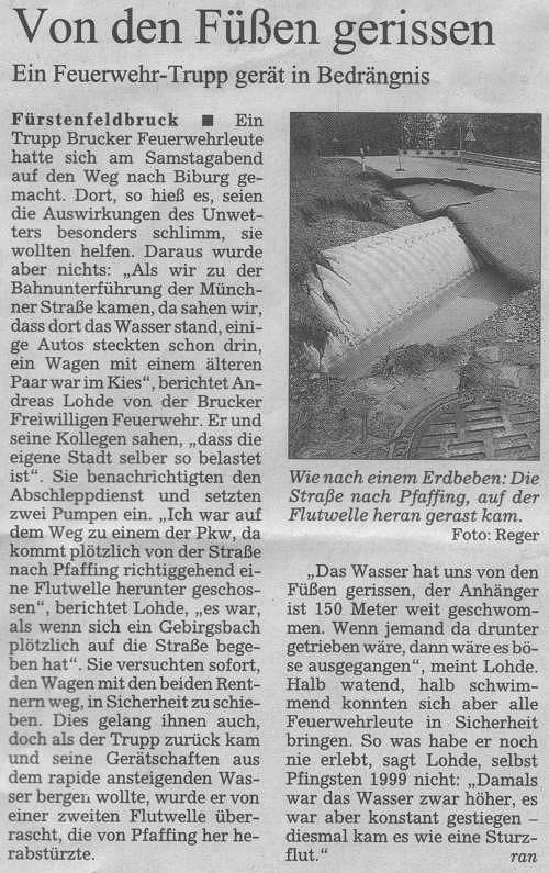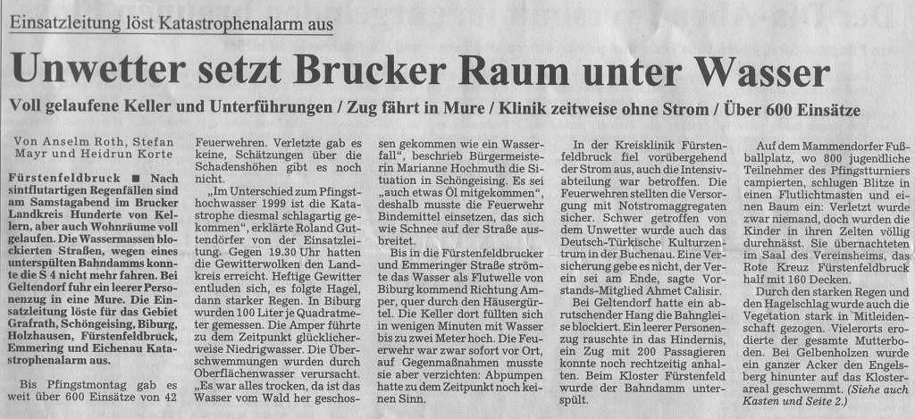 Germering war aber nicht das Zentrum der Regenfälle. Schlimmer erwischte es den übrigen Brucker Landkreis, speziell den Raum Biburg/Alling. Dort ging offensichtlich das meiste Wasser nieder. Ein Teil davon floss bergab, überzog Straßen mit Schlamm und machte Bahnunterführungen unpassierbar. Selbst ein Feuerwehrtrupp kam in Bedrängnis.