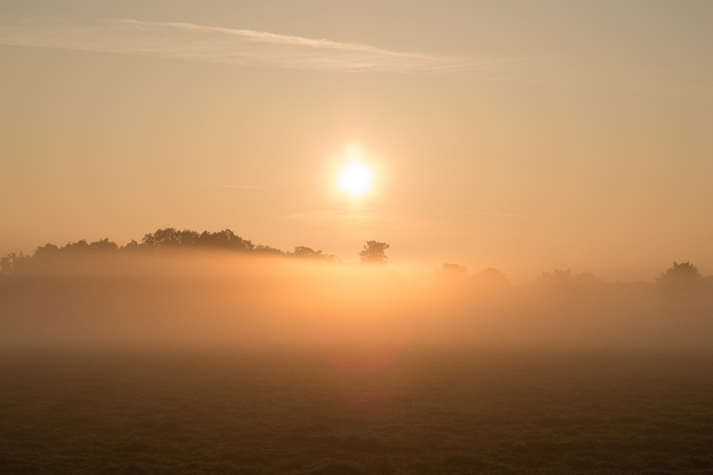 Die aufgehende Sonne erleuchtet die Nebelfelder langsam rötlich:
