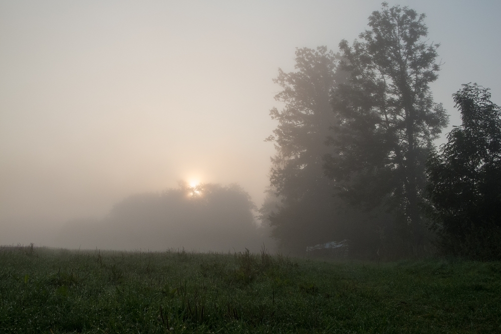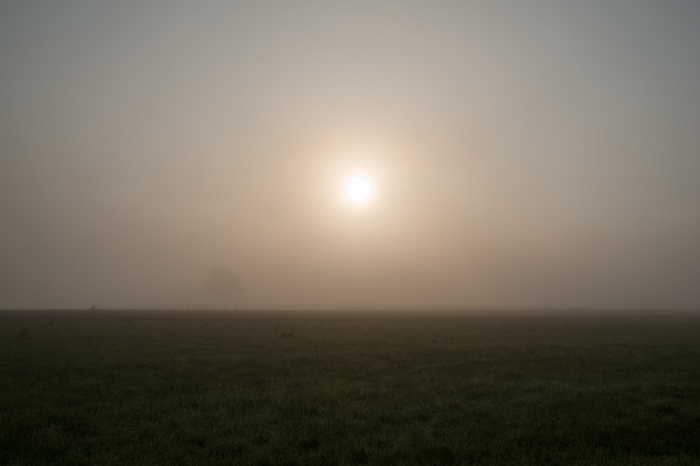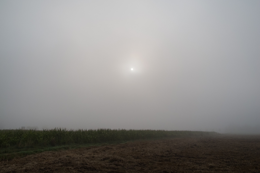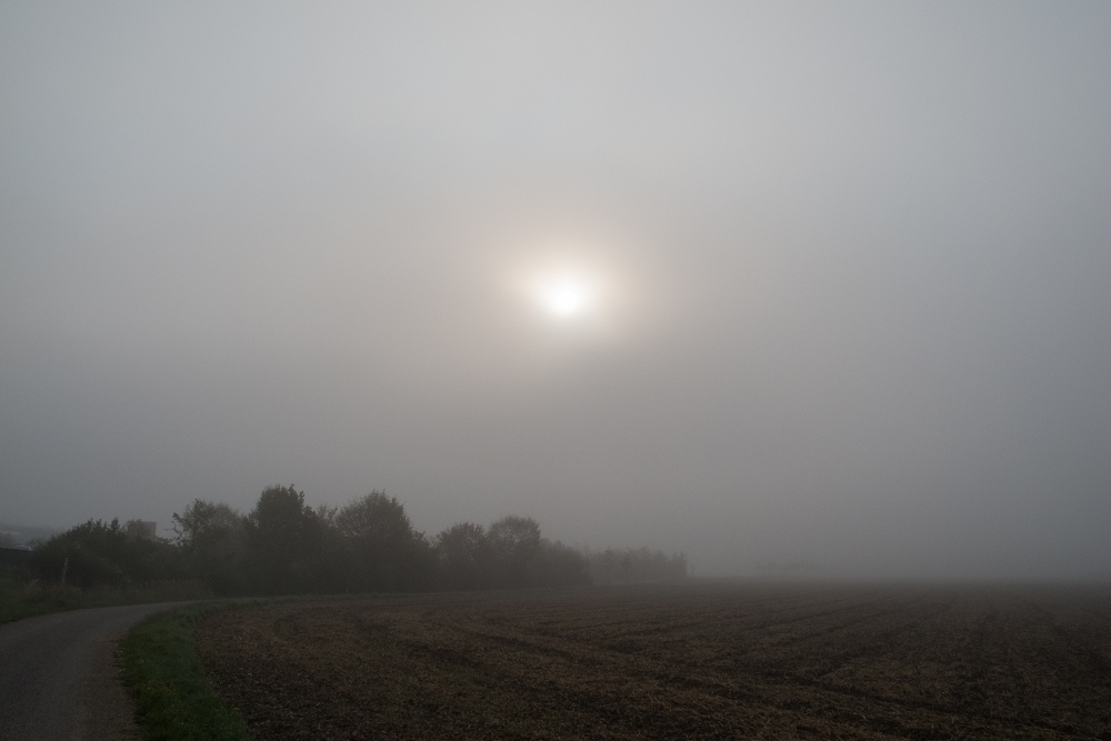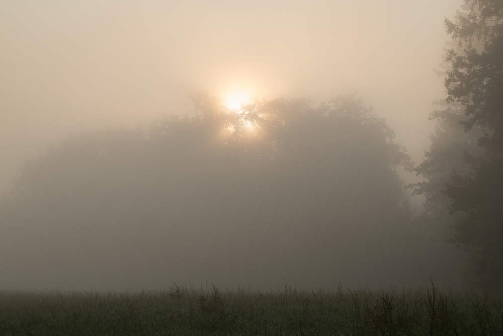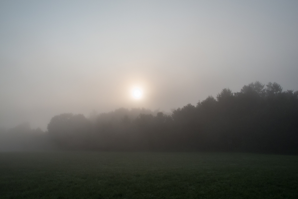 Die noch kräftige Sonne schimmert durch den Nebel: