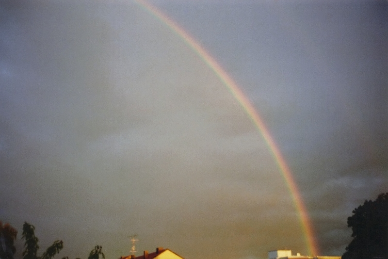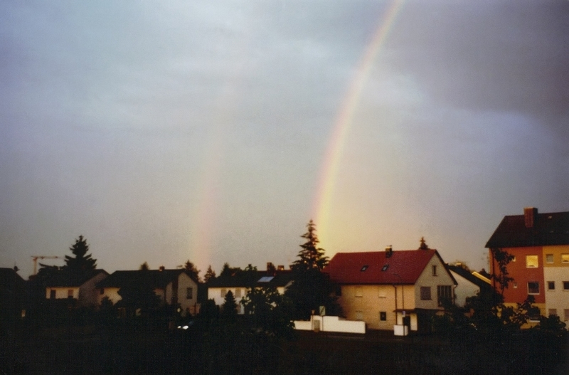 Am 30. Juli 2002 zog gegen 19 Uhr eine Gewitterzelle über Langen in Hessen hinweg. Nachdem die kräftige Gewitterzelle hinweggezogen war, kam die Sonne für kurze Zeit zum Vorschein, die Folge war ein Regenbogen.