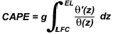 Das CAPE- zeigt den kumulativen Effekt der atmosphärischen Schichten an, die wärmer sind, als ein Luftpaket, das vertikal entlang einer Adiabaten aufsteigt. Diese stabilen Schichten behindern häufig das Aufsteigen von Luftpaketen aus den bodennahen Luftschichten.