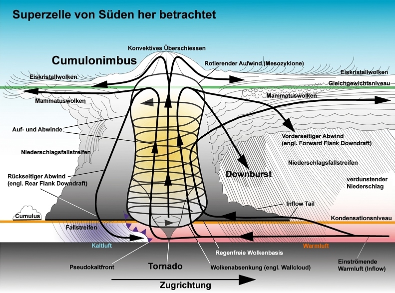 Bevor wir also auf die für das Verständnis wichtige Theorie der Superzelle eingehen, möchte ich noch eine schematische Darstellung zeigen, die eine Superzelle mit Tornado darstellt: